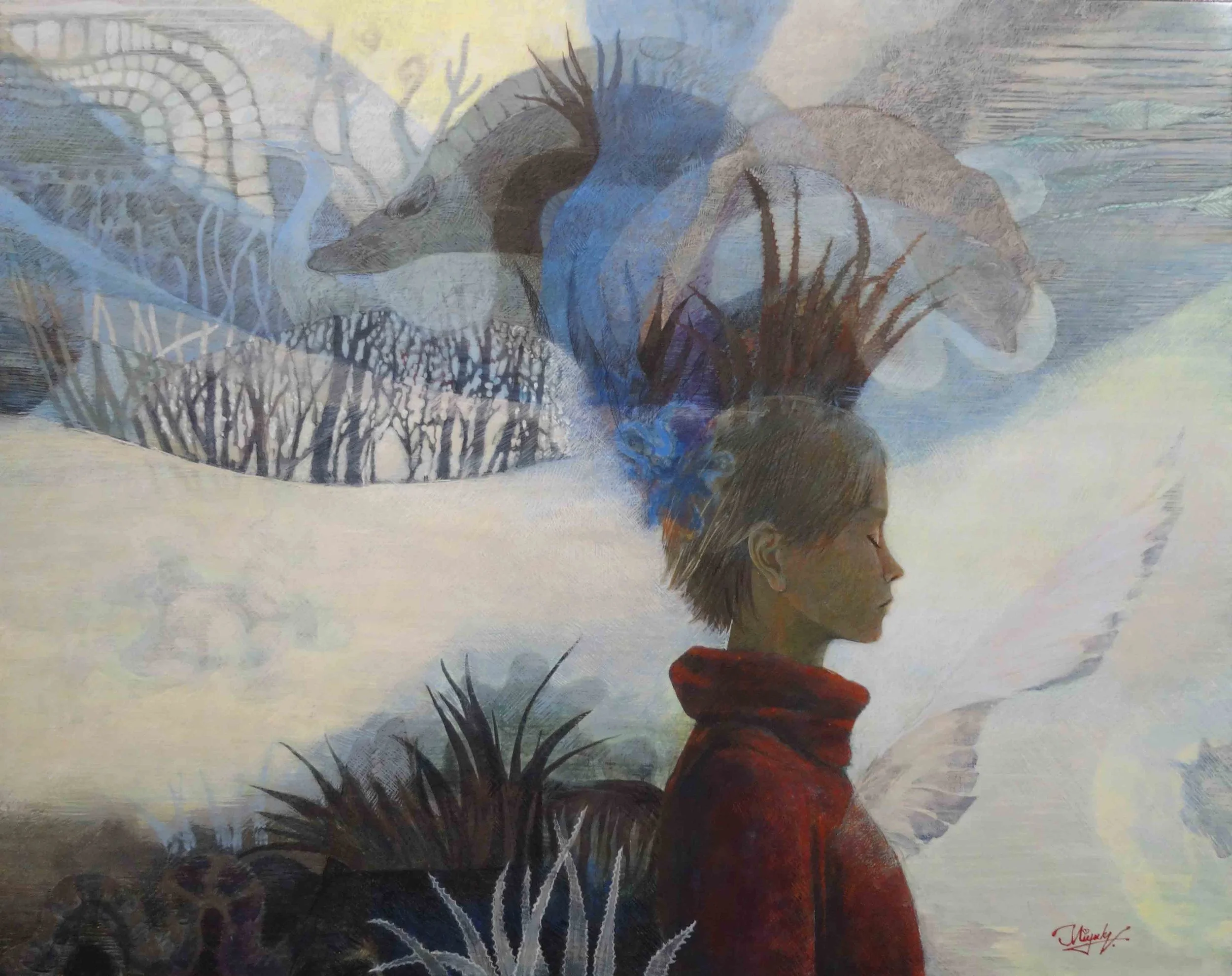 Takanashi Miyuki born and raised in Hokkaido, where she spends more than five months of the year with snow, she is a female painter who still lives in Sapporo. The main motifs are people, familiar creatures and plants and forests. She is working on large works using the mixing technique of oil painting and tempera. She is fascinated by the life of living creatures and plants in the harsh natural environment and by the sparkle of life. One of the key themes is that humans are part of nature too. With a style of painting that feels rhythm in silence, she creates a poetic and original world .