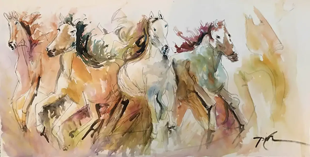 Pilar Ostolaza is a Mexican-Spanish painter with 30+ years behind the brush, known for luminous watercolours and occasional oil pieces that blend figuration and abstraction. Drawing on the legacy of Goya, Velázquez and Sorolla, she paints horses, bulls and sun-drenched plazas in flowing washes that celebrate light and movement.